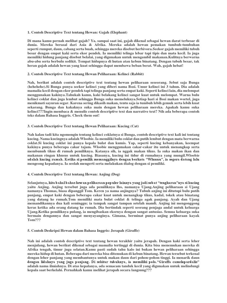 Structure teks descriptive terbagi menjadi dua, yaitu identification dan description: Identification (identifikasi), bagian ini berisikan . Berikut ini adalah contoh contoh descriptive text tentang hewan seperti kucing, anjing, kelinci, panda, gajah, ikan mas, dan jerapah. Dapatkan contoh descriptive text about my cat dan artinya lengkap di. Terjemahan contoh descriptive text tentang hewan. Itulah yang dapat kami bagikan terkait contoh descriptive text bahasa inggris tentang hewan dan terjemahannya. "my cat" atau kucingku dalam bahasa inggris beserta terjemahannya. Sadly javan tiger and balinese tiger are now facing the extinction while the population of sumatran tiger is decreasing day by day. Hadiah itu adalah seekor anjing. Perlu dipahami bahwa descriptive text . Nah, kali ini, kami akan mencoba mendeskripsikan hewan peliharaan. Anak anjing untuk lebih jelasnya. Terjemahan descriptive text singkat bahasa inggris tentang ikan cupang.